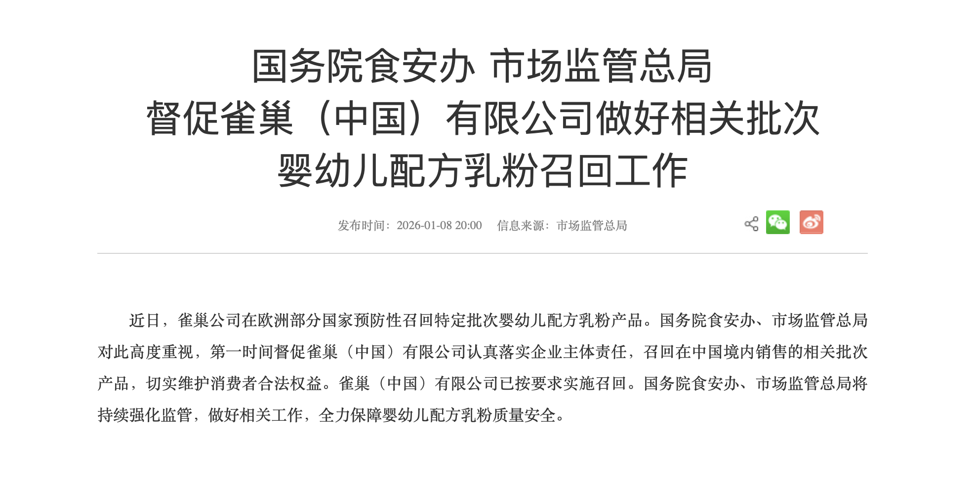 1月8日晚20点,国务院食安办及市场监管总局联合发文,督促雀巢中国落实主体责任,召回境内涉事批次婴幼儿配方乳粉,全力保障婴幼儿配方奶粉质量安全。