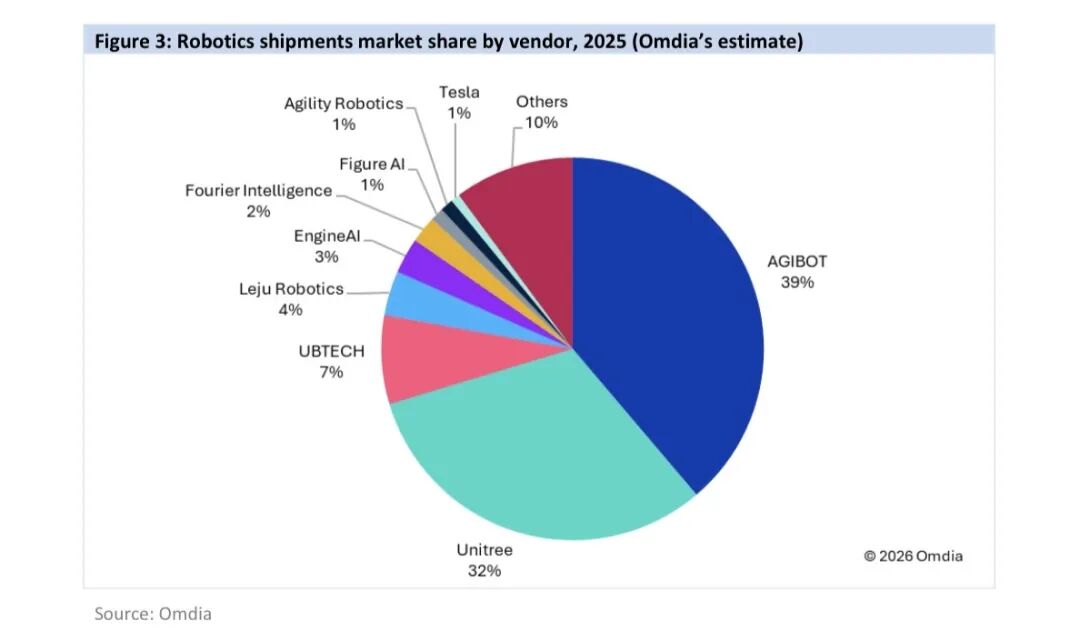 报告显示,宇树、优必选的2025年出货量分别为4200台、1000台,市场份额为32%、7%,分别为全球第二和第三。