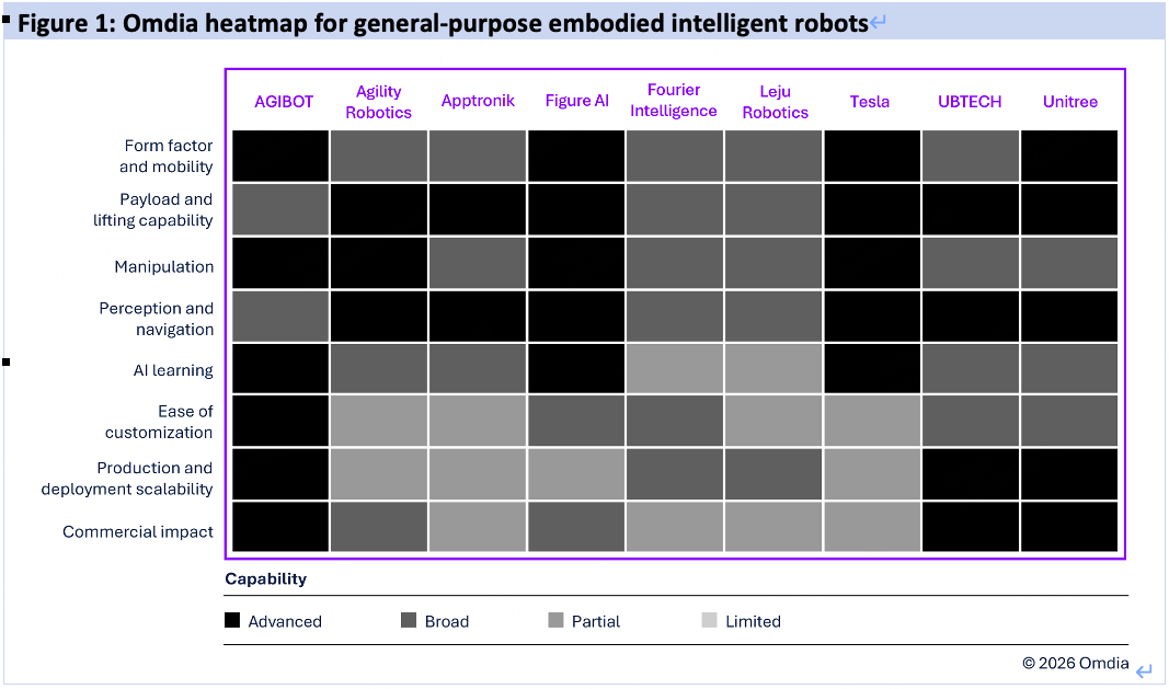 从竞争力的维度,Omdia设置了相应指标,为全球人形机器人公司划分梯队。其选用的评估维度包括产品形态、负载性能、灵巧操作、感知导航、AI学习、定制便捷、规模量产、规模商用等。