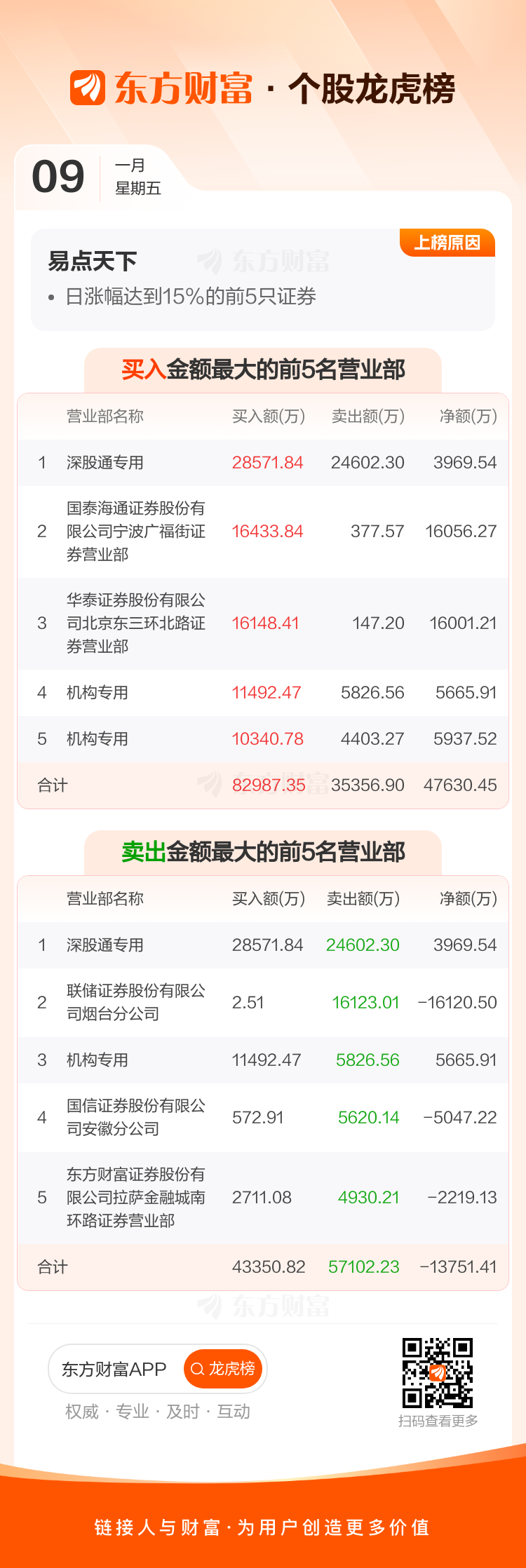 交易所2026年1月9日公布的交易公开信息显示,易点天下因成为日涨幅达到15%的前5只证券上榜。易点天下当日收报52.69元,涨跌幅20.00%,偏离值20.00%,换手率31.79%,成交额61.37亿。