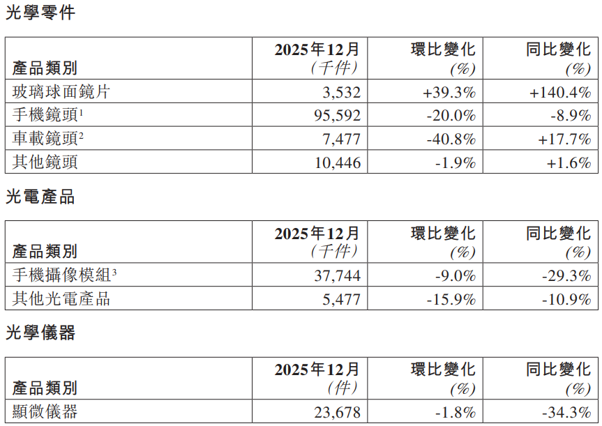 2025年12月,公司主要产品出货量中,手机镜头出货量为9559万件,环比下降20%,同比下降8.9%;车载镜头出货量为748万件,环比下降40.8%,同比增长17.7%。