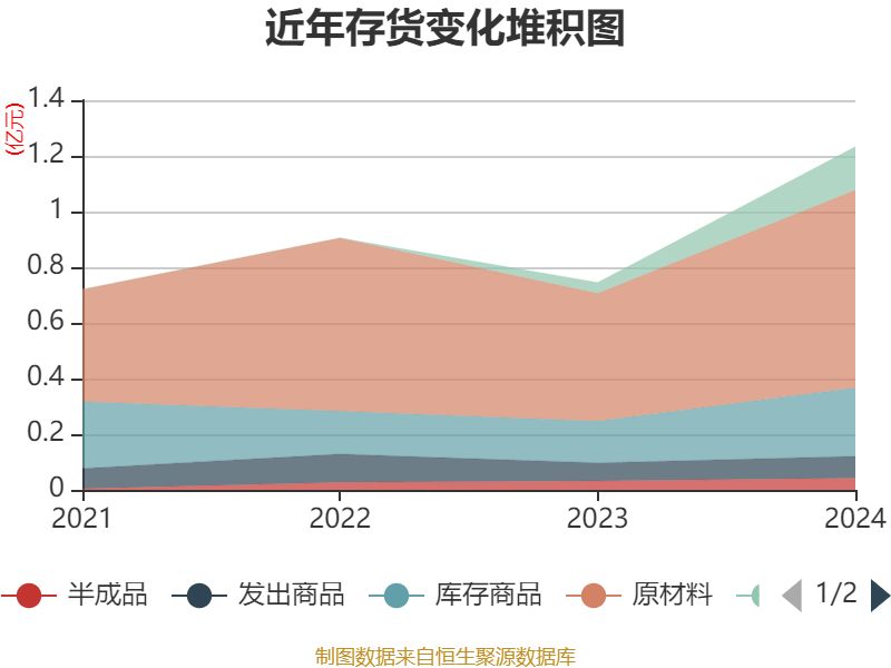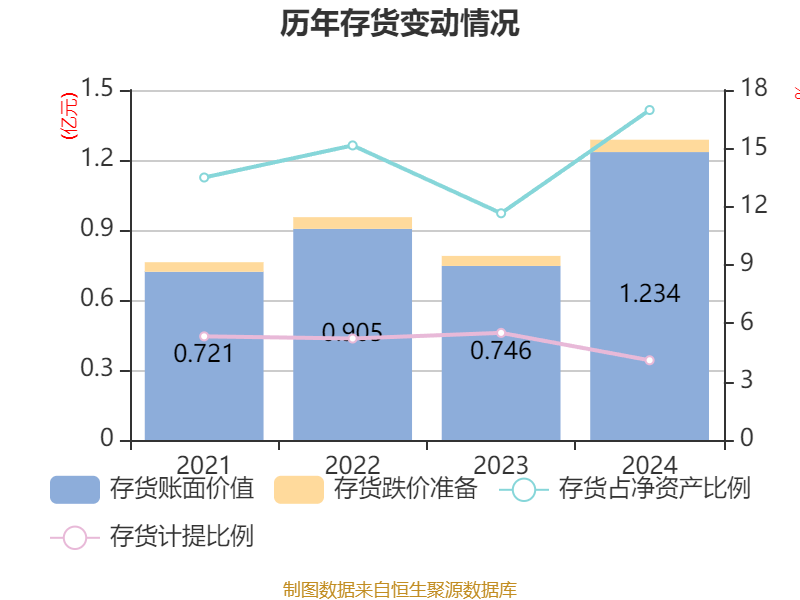 从存货变动来看,截至2024年末,公司存货账面价值为1.23亿元,占净资产的16.97%,较上年末增加4881.01万元。其中,存货跌价准备为526.95万元,计提比例为4.1%。