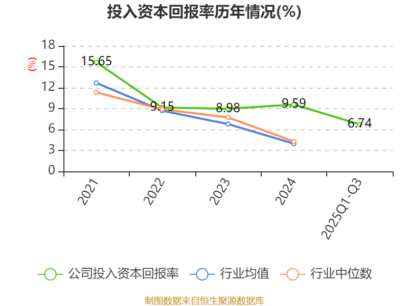 公司2024年投入资本回报率为9.59%,较上年同期上升0.61个百分点。2025年前三季度投入资本回报率为6.74%,较上年同期下降9.18个百分点。