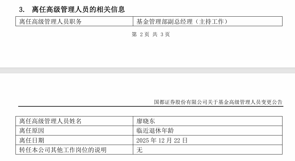根据公告,因临近退休年龄,廖晓东自今年1月4日起不再管理国都创新驱动、国都聚成混合两只混合型基金;目前这两只基金的管理工作由原共管基金经理继续担任。而就在去年12月下旬,公司宣布其卸任基金管理部副总经理(主持工作)职务,且不转任公司其他岗位,理由也是“临近退休年龄”。