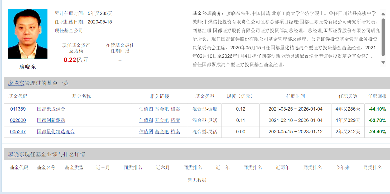 国都证券日前宣布,因临近退休年龄,基金经理廖晓东卸任国都聚成混合与国都创新驱动两只产品。而不到两周前,他才卸任了公司基金管理部副总经理(主持工作)职务。其历任3只公募基金产品任职回报均为负,最多者亏逾六成。