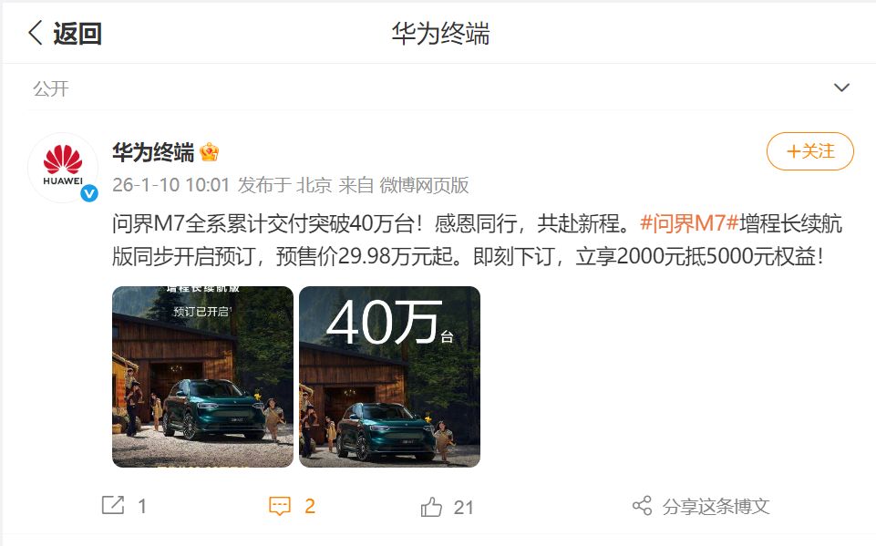 据华为终端官方微博1月10日消息,问界M7全系累计交付突破40万台!问界M7增程长续航版同步开启预订,预售价29.98万元起。