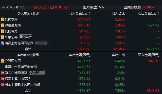 震有科技龙虎榜信息显示,买一和买三席位都是机构专用席位,其中买一席位买入1.61亿元,买二席位沪股通席位买入9845万元,买三机构席位买入3649万元,买五席位是瑞银上海花园石桥路营业部买入3017万元。
