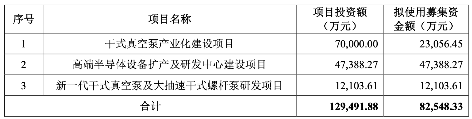 中科仪本次IPO拟募集资金8.25亿元,其中2.31亿元用于干式真空泵产业化建设项目、4.74亿元用于高端半导体设备扩产及研发中心建设项目,1.21亿元用于新一代干式真空泵及大抽速干式螺杆泵研发项目,上述3个项目合计投资总额为12.94亿元。