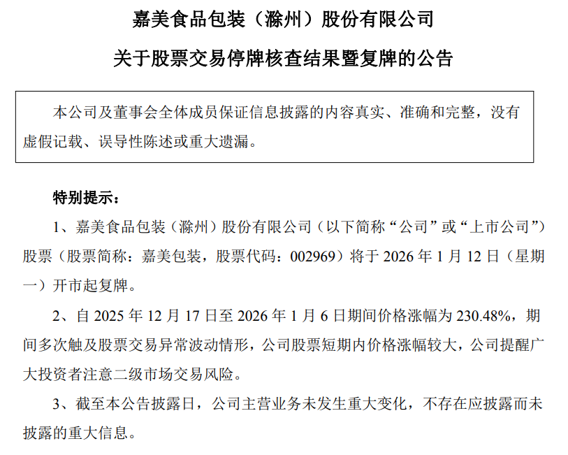 1月11日,嘉美包装公告,核查工作已完成,公司股票将于2026年1月12日开市起复牌。
