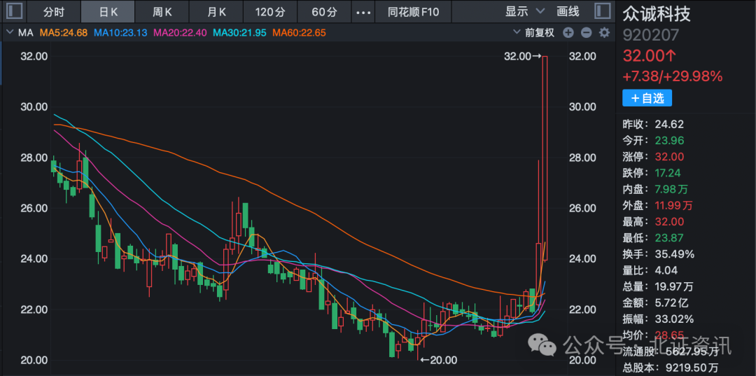 最近一周,小市值AI概念股众诚科技成为北交所股票“最靓的仔”。1月9日,该股强势涨停,当天收报32元/股,市值为29.5亿元。