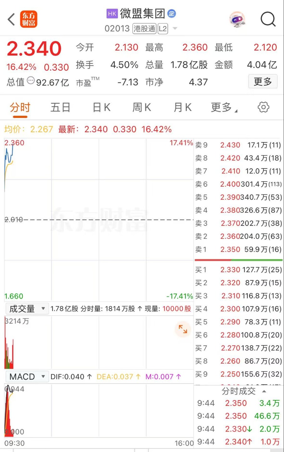 1月12日,微盟集团早盘拉升,一度涨超18%,截至9时45分,该股涨16.42%,报2.34港元/股。