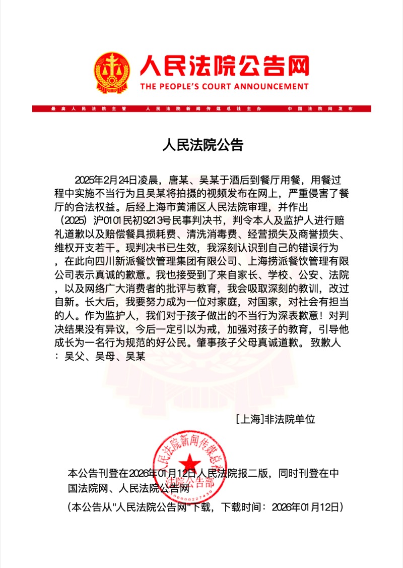 声明显示,2025年2月24日凌晨,唐某、吴某于酒后到餐厅用餐,用餐过程中实施不当行为且吴某将拍摄的视频发布在网上,严重侵害了餐厅的合法权益。后经上海市黄浦区人民法院审理,判令本人及监护人进行赔礼道歉以及赔偿餐具损耗费、清洗消毒费、经营损失及商誉损失、维权开支若干。现判决书已生效。