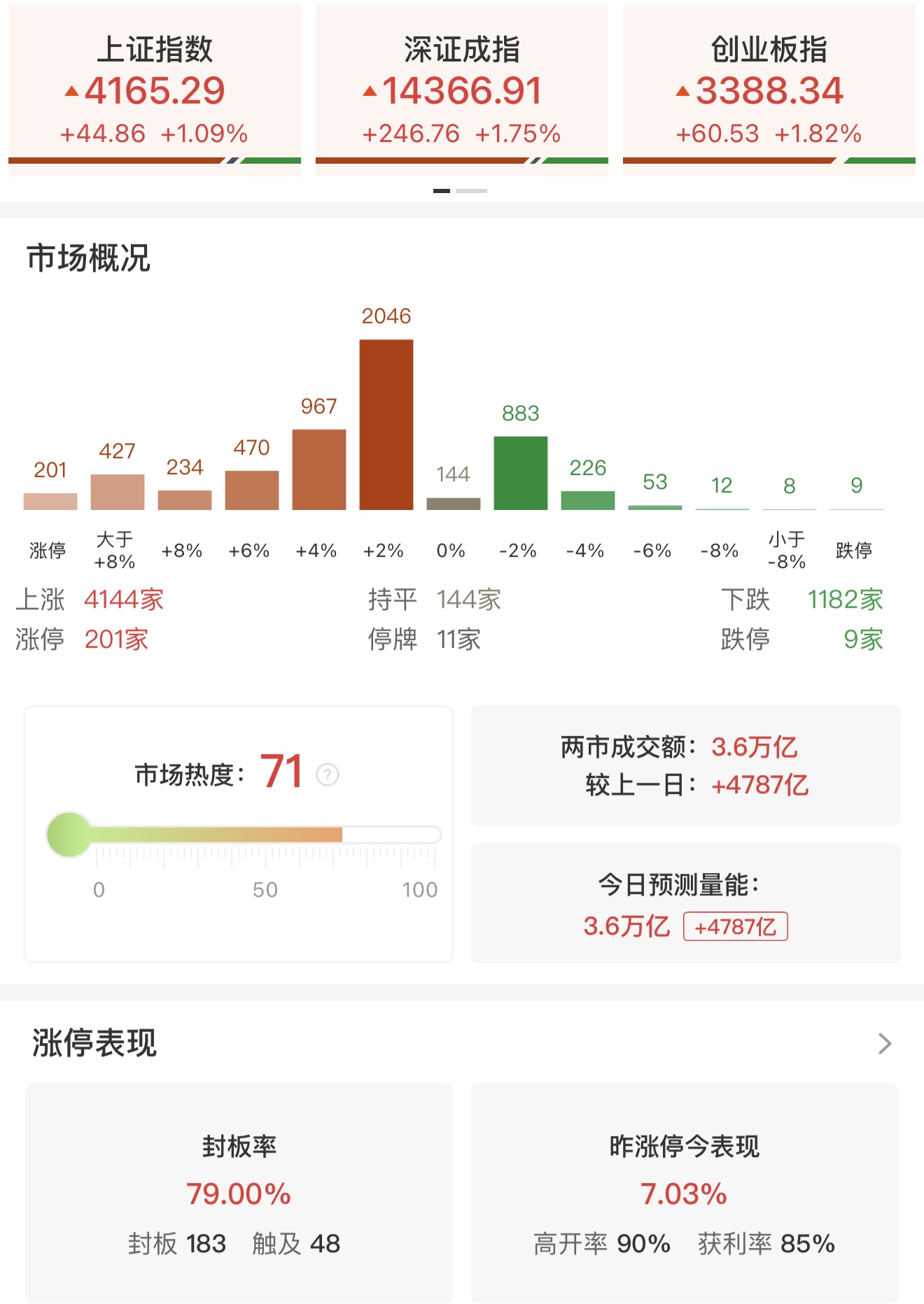 财联社1月12日电,市场震荡拉升,三大指数均涨超1%,创业板指探底回升,此前一度跌超1%。沪深两市成交额3.6万亿,连续第2个交易日突破3万亿,较上一个交易日放量4787亿,刷新此前在2024年10月8日创下的成交额历史纪录。盘面上,市场热点轮番活跃,全市场超4100只个股上涨,其中201只个股涨停。从板块来看,AI应用概念全线爆发,引力传媒6天5板,利欧股份、美年健康、天下秀、省广集团2连板,卫宁健康、新点软件、福昕软件等多股涨停。商业航天概念延续强势,金风科技5连板,通宇通讯4天3板。可控核聚变概念表现活跃,中国核建4天3板。下跌方面,保险、油气、房地产等板块跌幅居前。截至收盘,沪指涨1.09%,深成指涨1.75%,创业板指涨1.82%。