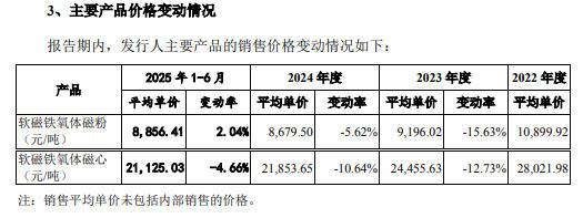 根据招股书,春光集团的主要产品单价变动明显。2022-2024年,软磁铁氧体磁粉的单价由10899.92元/吨降至8679.5元/吨;软磁铁氧体磁心平均单价由28021.98元/吨降至21853.65元/吨。不过,2025年1-6月,软磁铁氧体磁粉的单价略有回升,至8856.41元/吨;但软磁铁氧体磁心的单价持续下滑至21125.03元/吨。