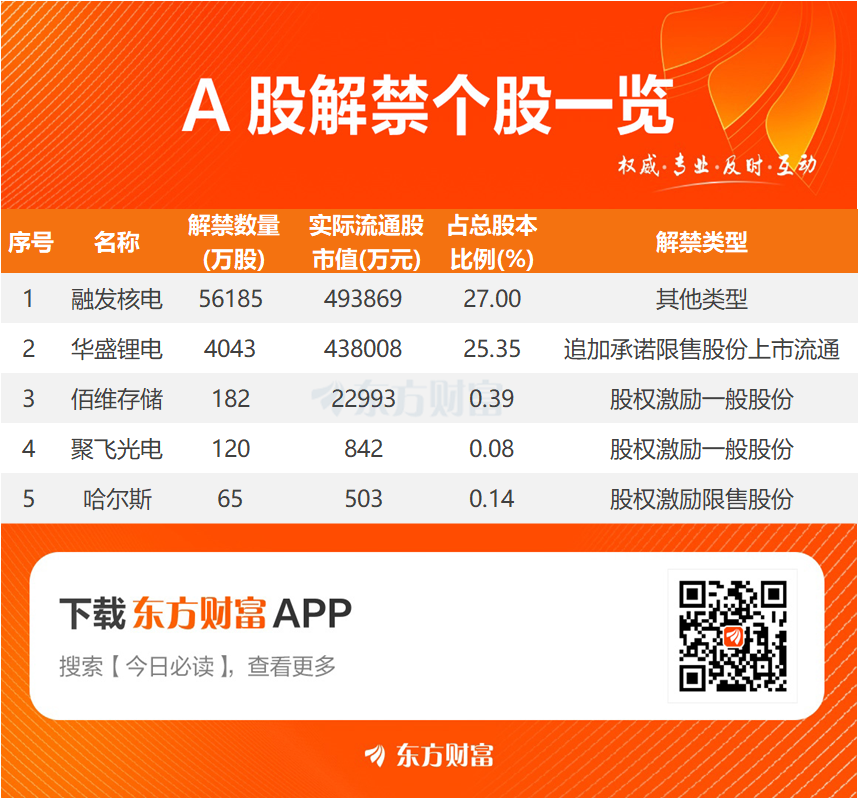 从解禁市值看,东方财富Choice数据显示,明日面临解禁的5只股票中,融发核电、华盛锂电、佰维存储居前,解禁市值分别为49.39亿元、43.80亿元、2.30亿元。解禁比例方面,融发核电、华盛锂电、佰维存储分别为27%、25.35%、0.39%,居于前列。