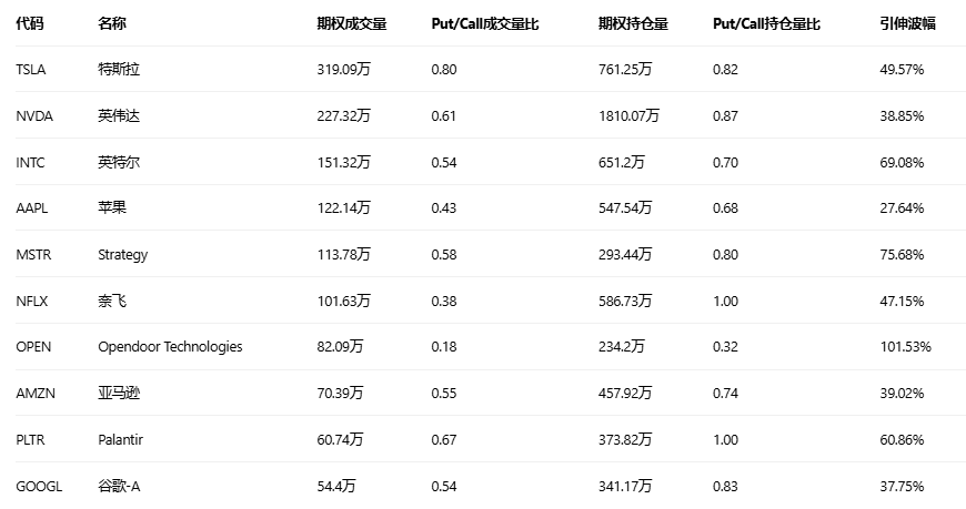 期权成交量前10的股票中,特斯拉的看跌/看涨成交量比最高,达到0.80。马斯克旗下xAI公司1至9月支出78亿美元用于数据中心建设和人才招聘,加州州长提议2亿美元电动车税收补贴,英伟达发布Alpamayo自动驾驶技术引发特斯拉竞争担忧。