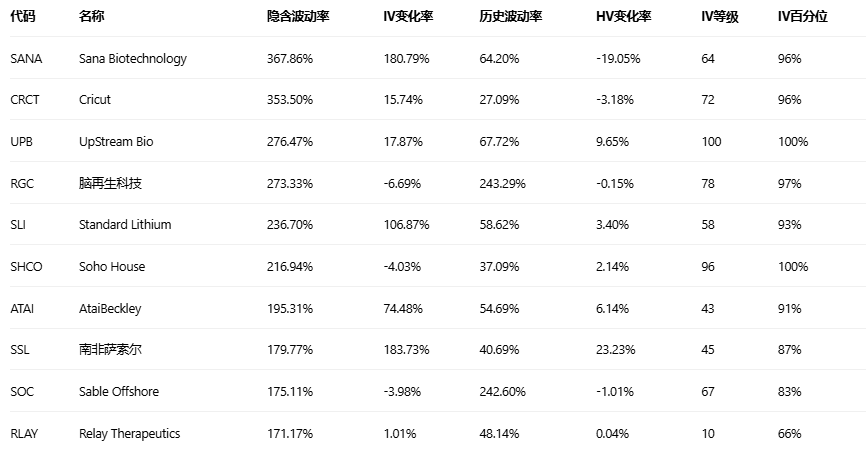 美股期权波动率排行榜前十(标的市值>100亿美元,且期权成交量>10万张)