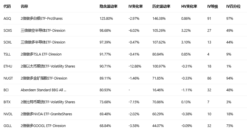 美股ETF引申波幅排行榜前十(标的要求:市值>100亿美元)