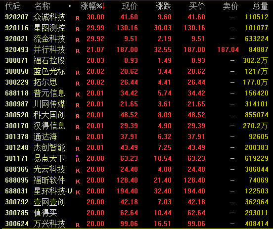 AI应用概念盘中集体爆发,个股掀涨停潮。截至收盘,众诚科技、星图测控、流金科技30%涨停,蓝色光标、易点天下、万兴科技、海天瑞声、昆仑万维、值得买等均涨停。