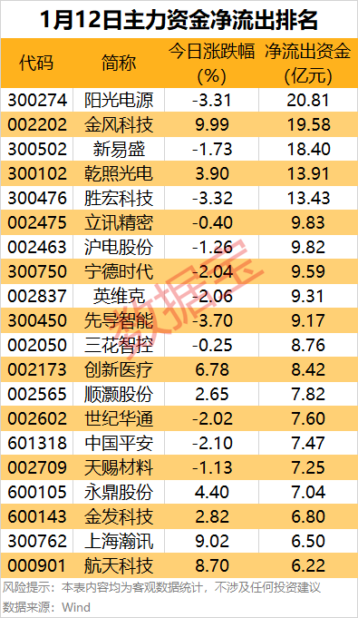 据数据宝统计,逾160股主力资金净流出均超1亿元,其中5股净流出金额均超13亿元。阳光电源主力资金净流出20.81亿元,居首。