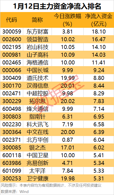 互联网券商龙头东方财富主力资金净流入18.1亿元,居首,股价上涨3.81%。领益智造、岩山科技、山子高科、海格通信、中国长城等涨停股主力资金净流入金额居前,均超8亿元。