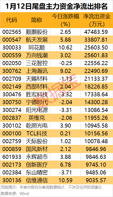 此外,航天发展、同花顺、万向钱潮、三花智控和上海瀚讯等尾盘主力资金净流出均超2亿元。