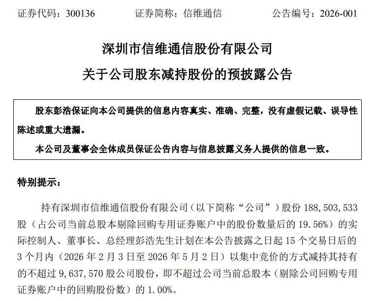 信维通信1月12日晚间公告,公司实际控制人、董事长、总经理彭浩计划在本公告披露之日起15个交易日后的3个月内(2026年2月3日至2026年5月2日)以集中竞价的方式减持其持有的不超过9,637,570股公司股份,即不超过公司当前总股本(剔除公司回购专用证券账户中的回购股份数)的1.00%。