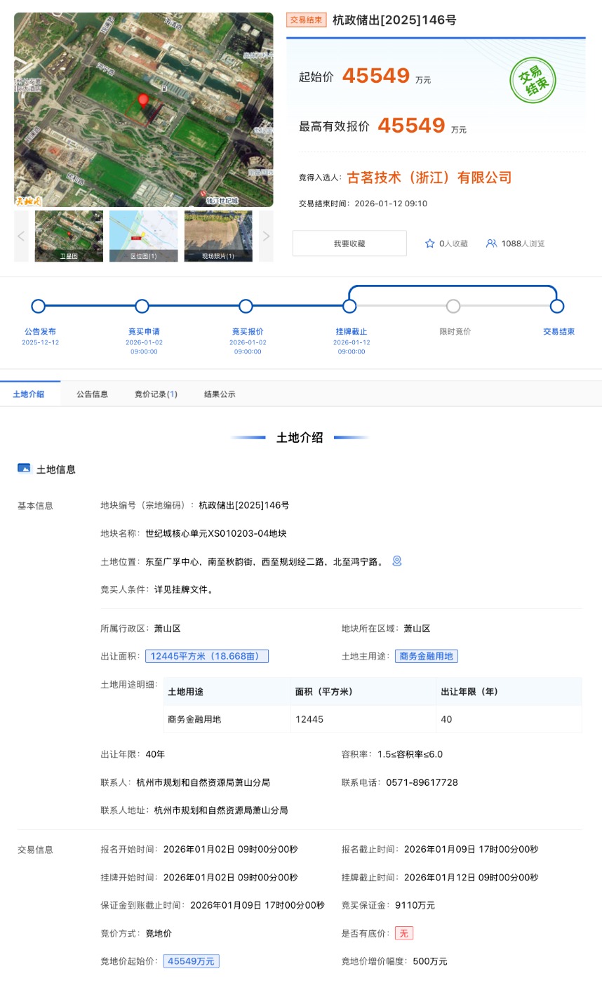 古茗4.55亿元竞得杭州钱江世纪城核心地块