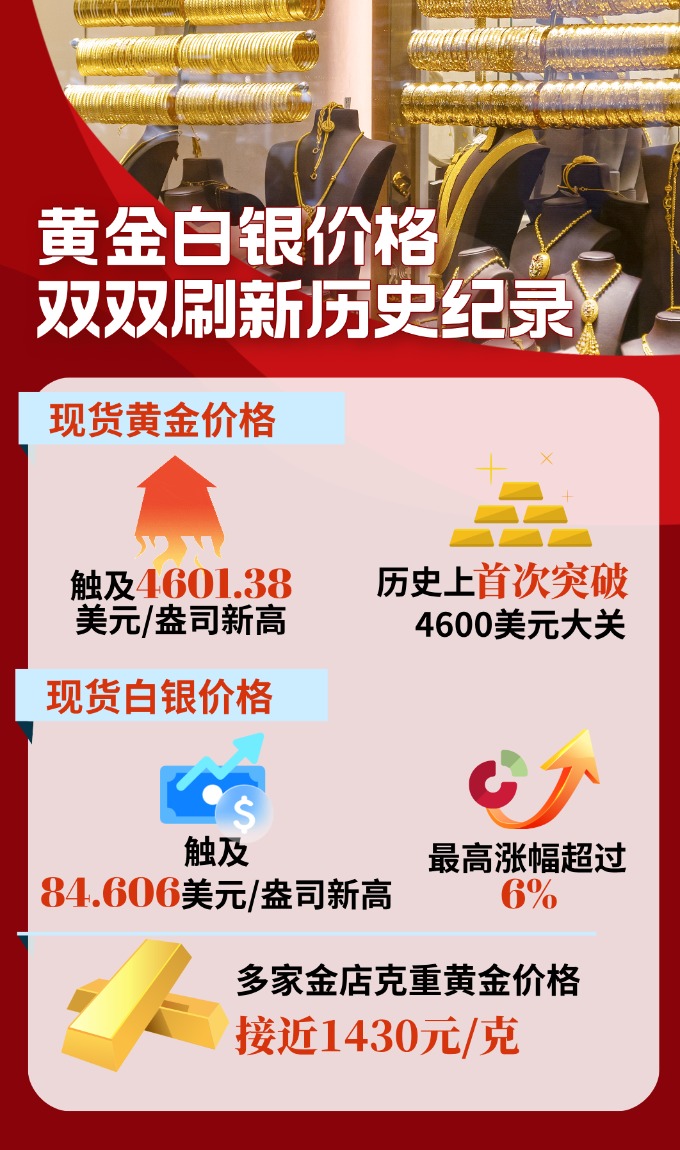 黄金价格突破4600美元大关,白银价格一度涨逾6%……1月12日,开启新一轮“疯涨”模式的贵金属价格,又一次刷新了历史纪录,并成功引爆了市场话题。