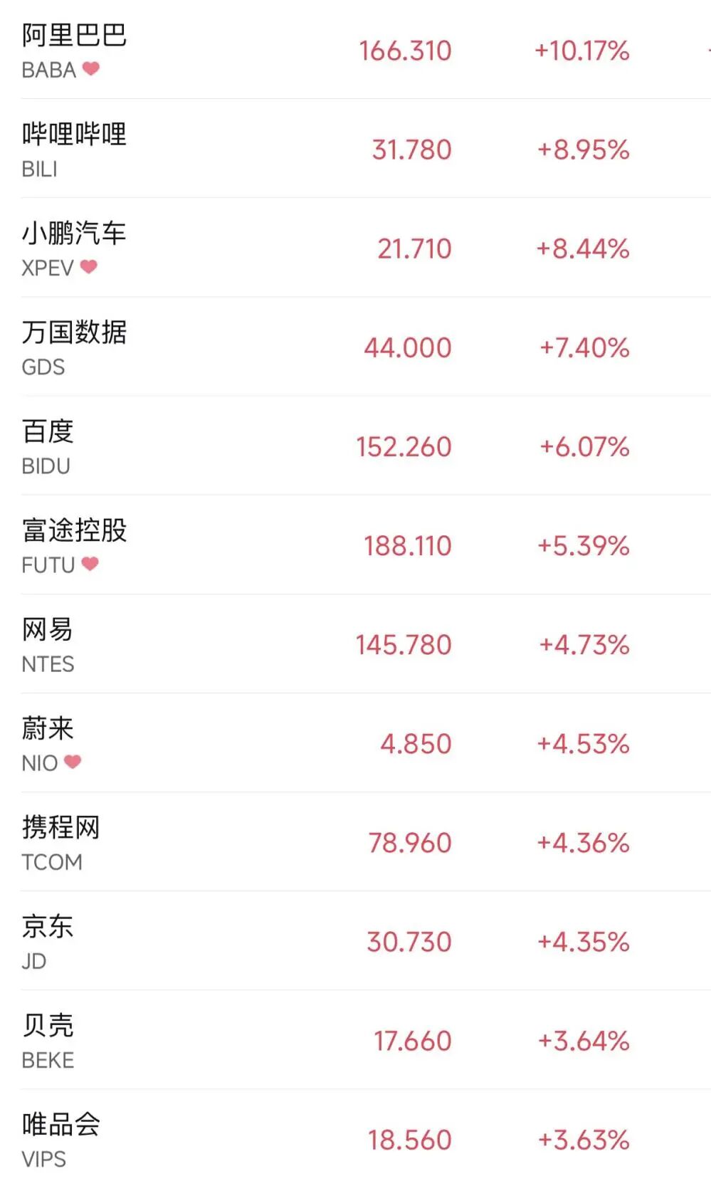 热门股方面,阿里巴巴涨超10%,创去年8月29日以来最大升幅;哔哩哔哩、小鹏汽车等涨超8%,万国数据涨超7%,百度涨超6%,蔚来、网易、京东涨超4%。