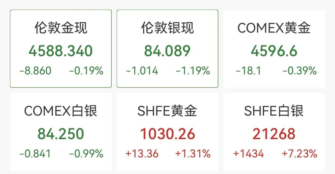截至发稿,金、银有所回落。COMEX黄金期货跌0.39%,报4596.6美元/盎司,此前盘中曾一度刷新历史高位至4640.50美元/盎司。COMEX白银期货跌0.99%,报84.25美元/盎司。