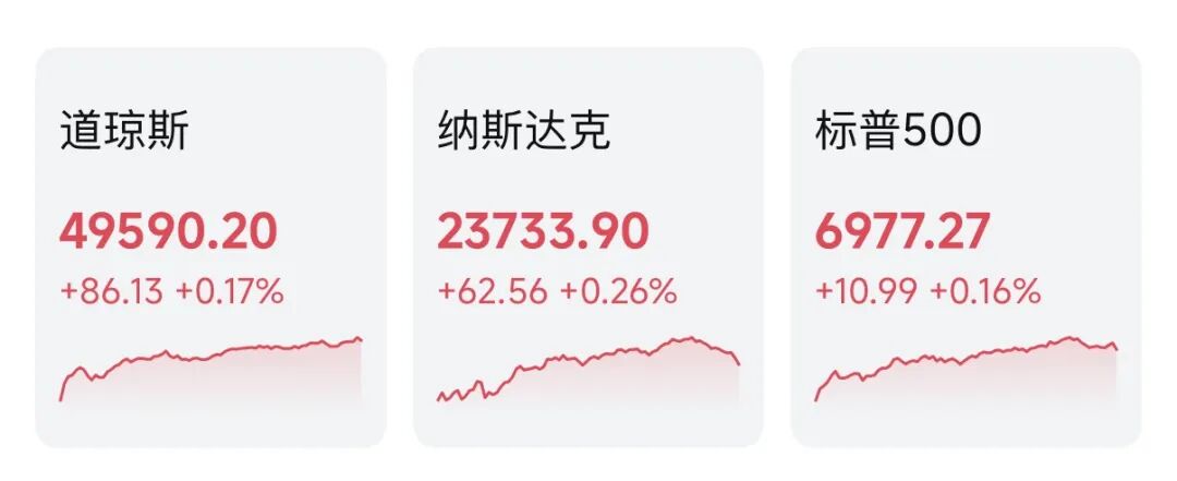 截至收盘,道指涨0.17%,报49590.2点;标普500指数涨0.16%,报6977.27点;纳指涨0.26%,报23733.9点。