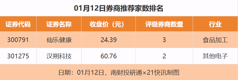 从券商推荐家数来看,1月12日有22家上市公司得到券商推荐,其中仙乐健康获得3家推荐,汉朔科技获得2家推荐,海澜之家等获得1家推荐。