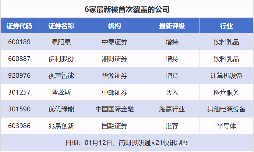 首次覆盖方面,1月12日券商共给出了6次首次覆盖,其中泉阳泉获得中泰证券给予“增持”评级,伊利股份获得湘财证券给予“增持”评级,视声智能获得华源证券给予“增持”评级,普蕊斯获得中邮证券给予“买入”评级,优优绿能获得中国国际金融给予“跑赢行业”评级。