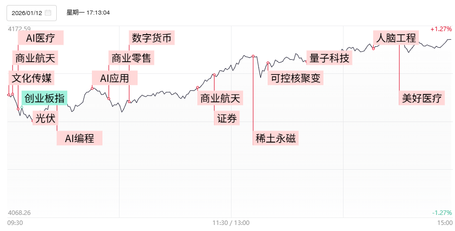 财联社1月13日电,上个交易日市场震荡拉升,三大指数均涨超1%,创业板指探底回升,此前一度跌超1%。全市场超4100只个股上涨。沪深两市成交额3.6万亿,连续第2个交易日突破3万亿,较上周五放量4787亿,刷新此前在2024年10月8日创下的成交额历史纪录。1)马斯克在X平台发帖称,X将在七天内向公众开放其最新推荐算法代码,AI应用端的人气受此提振再上新台阶,港股两只上周上市的大模型概念股智谱和MiniMax盘中一度涨超60%和近40%,蓝色光标、易点天下、天龙集团、百纳千成等20厘米个股悉数涨停。2)记者查询国际电信联盟(ITU)官网获悉,我国2025年12月向ITU申请了超20万颗卫星的频轨资源。上周火爆的商业航天概念依旧得到资金热捧,连板股银河电子晋级6连板,人气核心鲁信创投、金风科技、中国卫通、中国卫星等悉数封板,带动低位弹性标星图测控、天润科技、华力创通等大面积封板,进而带动多只卫星相关ETF封涨停。3)2026核聚变能科技与产业大会即将召开,可控核聚变概念午后大面积爆发并加速向上,弘讯科技弱转强实现晋级4连板,趋势股中国核建、雪人集团实现反包板,国光电气、哈焊华通等多股涨超10%并创出阶段新高。4)消息面上,工信部表示,“十五五”时期将聚焦量子科技、脑机接口等领域,加强技术攻关、企业培育。午后量子科技、脑机接口概念轮动向上展开补涨,量子科技概念龙头国盾量子涨超14%,创出历史新高。脑机接口概念人气股道氏技术、岩山科技双双封涨停。