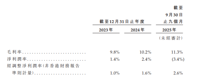 财务数据方面,2023年和2024年,钱大妈的营收分别为117.44亿元和117.87亿元,2025年前三季度的营收为83.59亿元。2023年和2024年、以及2025年前三季度,钱大妈的毛利率分别为9.8%、10.2%以及11.3%;经调整净利润分别为1.16亿元、1.93亿元以及2.15亿元。
