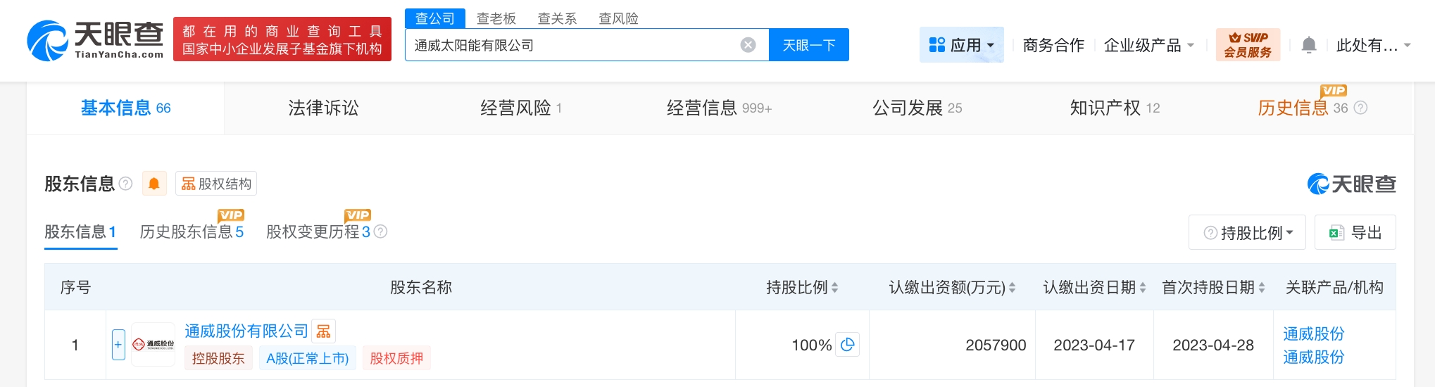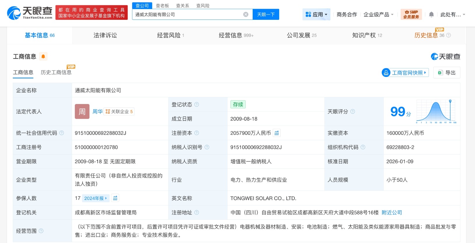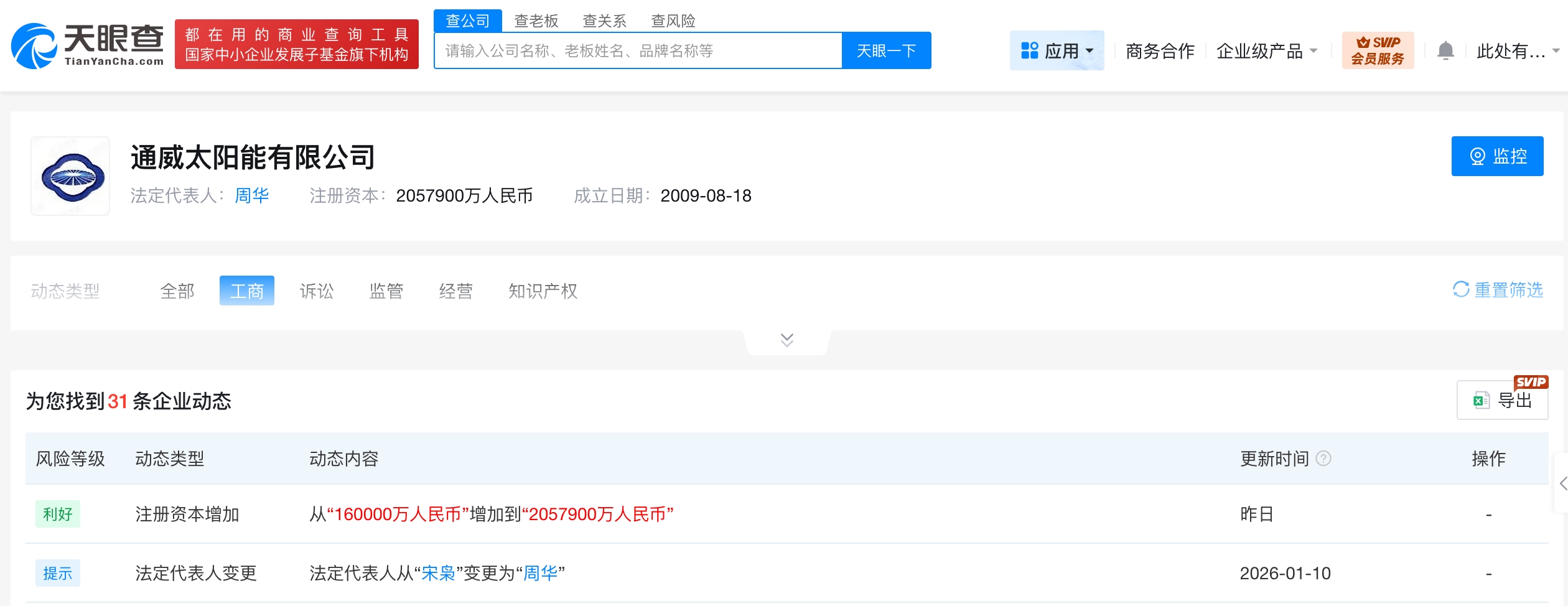 每经AI快讯,天眼查工商信息显示,近日,通威太阳能有限公司发生工商变更,注册资本由16亿元人民币增至205.79亿元人民币,增幅约1186%,同时,法定代表人由宋枭变更为周华。该公司成立于2009年8月,经营范围为电器机械及器材制造、安装,电池制造,燃气、太阳能及类似能源家用器具制造,商品批发与零售,进出口业,商务服务业,专业技术服务业。股东信息显示,该公司由通威股份(600438)全资持股。