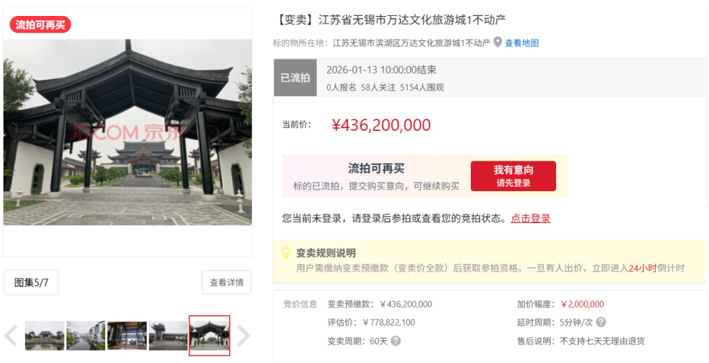 1月13日,据京东拍卖网披露的信息显示,江苏省无锡市万达文化旅游城1不动产因无人出价已流拍,起拍价为4.362亿元,评估价约7.78亿元。