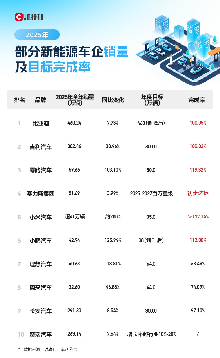 2025全年维度来看,新能源汽车市场竞争格局分化明显,头部车企表现稳健。比亚迪以460.24万辆销量登顶,完成率100.05%,纯电销量跃居全球第一;吉利汽车紧随其后,302.46万辆销量成功完成目标。