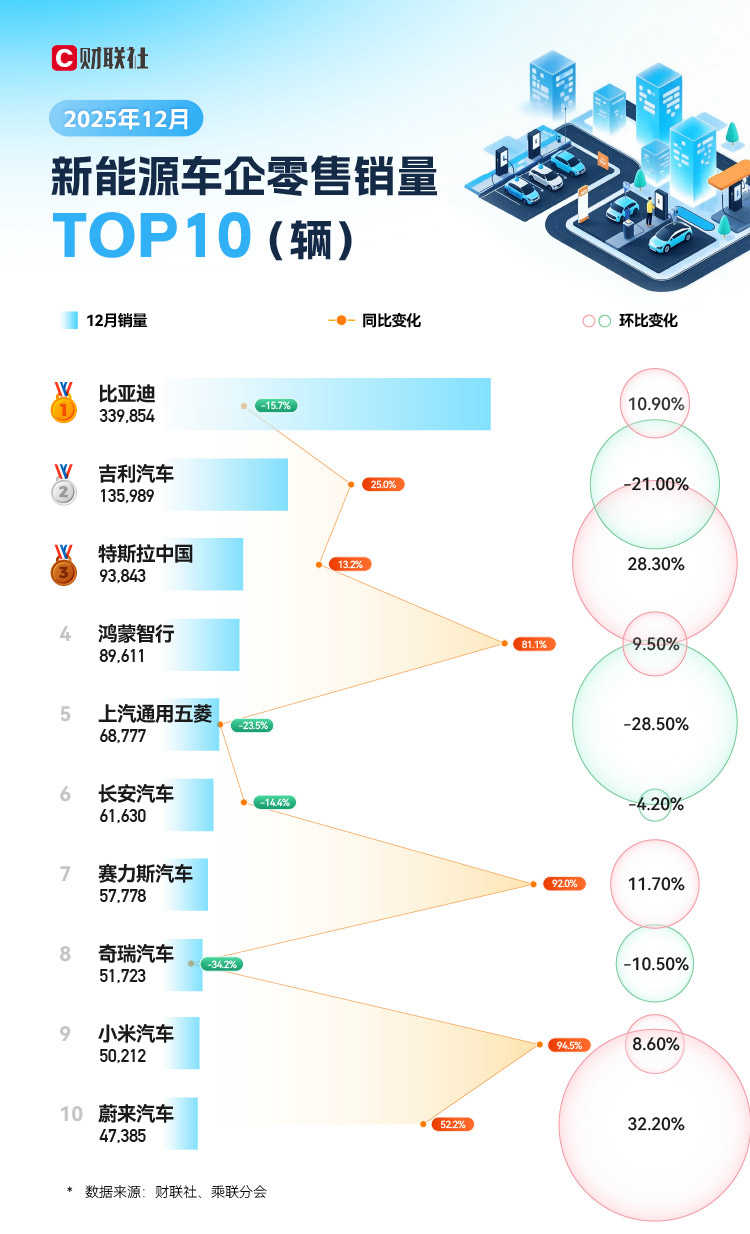 比亚迪汽车以339854辆的零售销量蝉联12月冠军,连续第六个月同比负增,环比增长10.9%较前一月有所扩大;吉利汽车以135989辆位居第二,虽同比增长25.0%延续高增,但环比大幅下滑21.0%,与榜首的差距再次拉大;特斯拉中国延续了11月环比暴增180%的强劲势头,12月再以93843辆的成绩跃居第三——不仅环比继续增长28.3%,同比也实现13.2%的正增,凭借新配置车型的热度实现强势反弹。