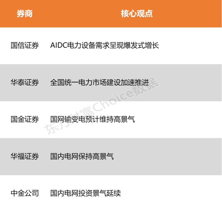 国信证券表示,电力设备行业受益于全球数据中心建设浪潮,AIDC电力设备需求呈现爆发式增长,变压器、开关柜等环节龙头企业有望受益。华泰证券指出,全国统一电力市场建设加速推进,预计“十五五”期间电网投资有望达到4万亿元以上,相比于“十四五”期间电网投资2.8万亿元显著提升。