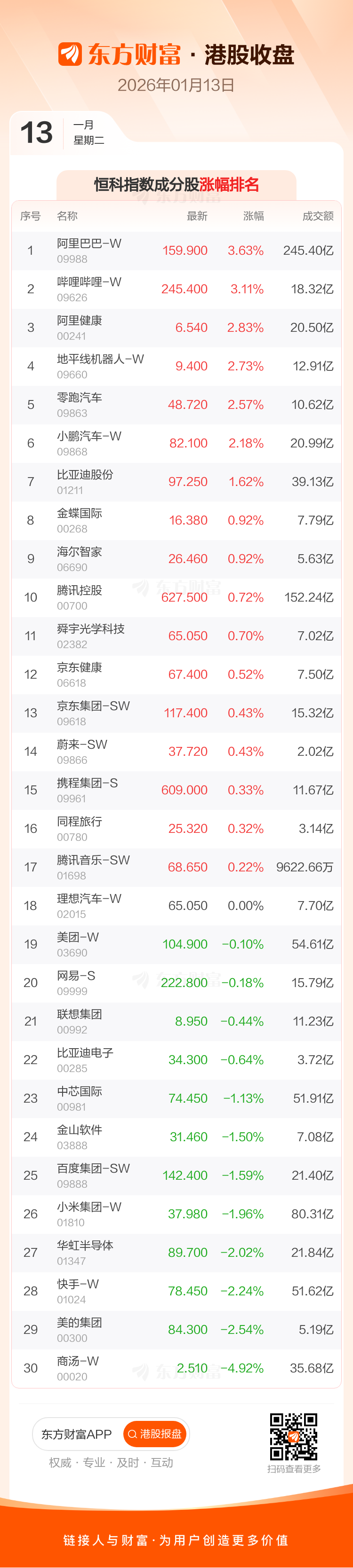 1月13日,恒生指数收报26848.47点,涨239.99点,涨幅0.9%;恒生科技指数收报5869.79点,涨6.59点,涨幅0.11%。恒生指数成分股中药明康德、药明生物、阿里巴巴-W涨幅居前,康师傅控股、华润万象生活、泡泡玛特跌幅靠前。恒生科技指数成分股中阿里巴巴-W、哔哩哔哩-W、阿里健康涨幅居前,商汤-W、美的集团、快手-W跌幅靠前。