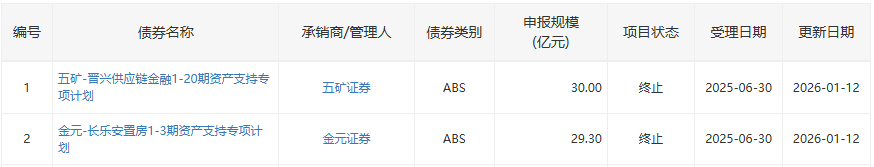 其中,“五矿-晋兴供应链金融1-20期资产支持专项计划”项目状态更新为终止。该债券拟发行金额30亿元,发行人为深圳前海联易融商业保理有限公司,承销商/管理人为五矿证券有限公司,受理日期为2025年6月30日。
