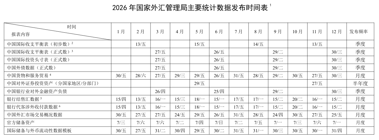 为进一步方便社会公众获取国际收支及相关数据,现公布《2026年国家外汇管理局主要统计数据发布时间表》。
