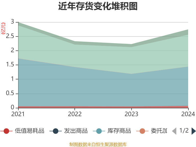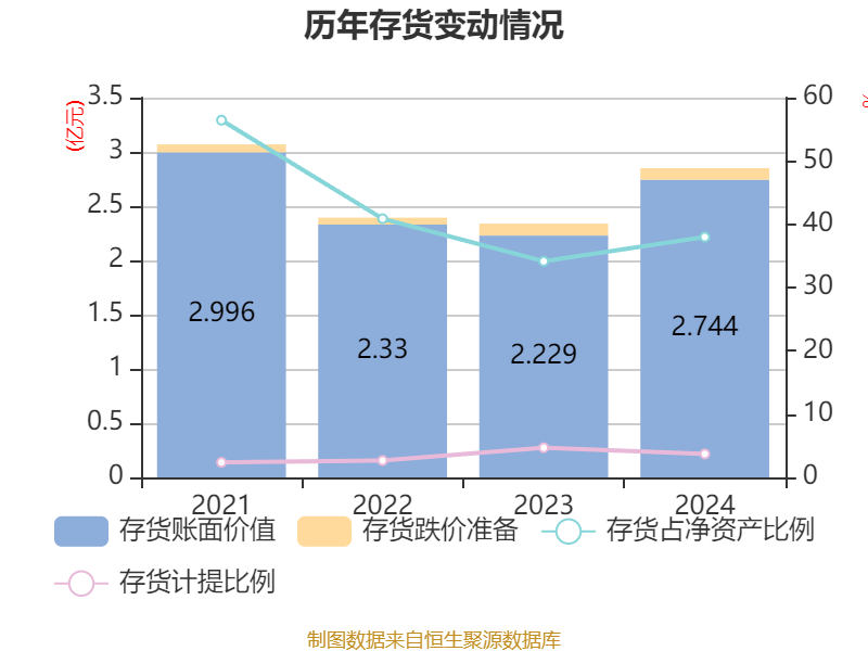 从存货变动来看,截至2024年末,公司存货账面价值为2.74亿元,占净资产的37.98%,较上年末增加5150.51万元。其中,存货跌价准备为1056.53万元,计提比例为3.71%。