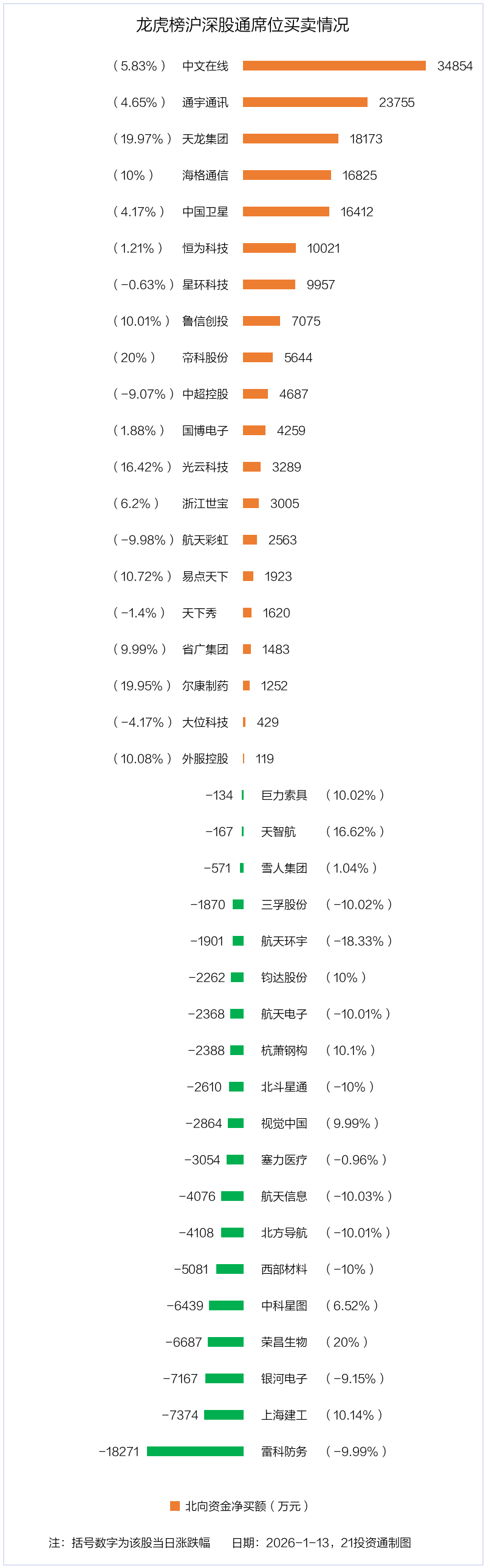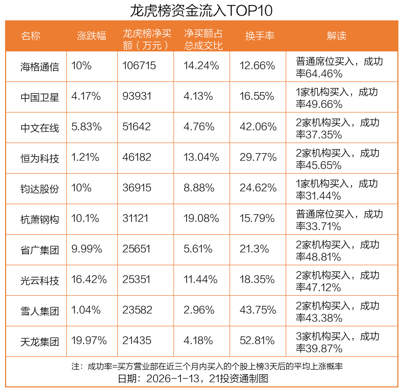 1月13日,上证指数下跌0.64%,深证成指下跌1.37%,创业板指下跌1.96%。盘后龙虎榜数据显示,共有69只个股因当日异动登上龙虎榜,资金净流入最多的是海格通信(002465.SZ),达10.67亿元。