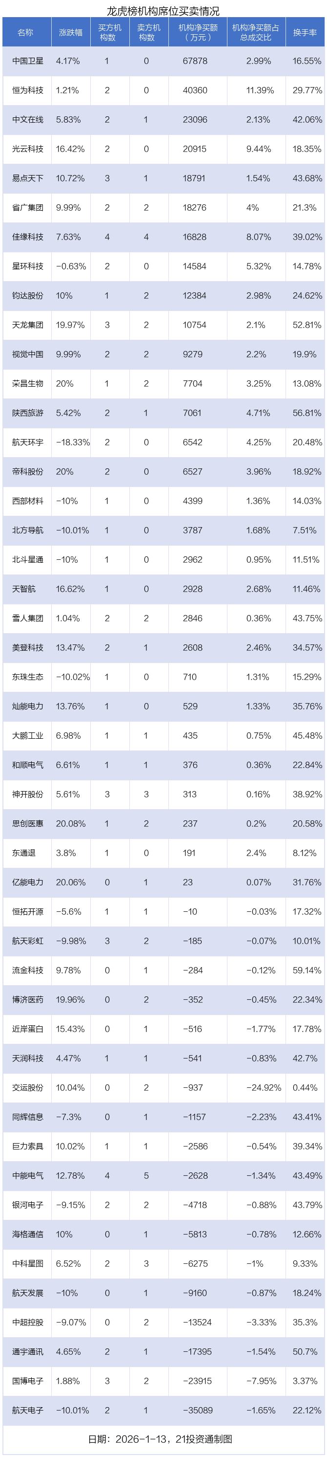 其中,机构净买入金额最多的是中国卫星(600118.SH),当日收盘上涨4.17%,换手率为16.55%。