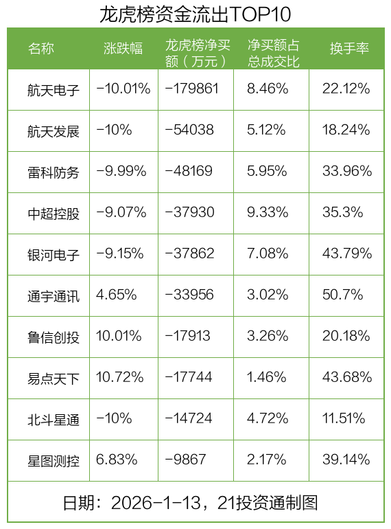 而龙虎榜中资金净流出最多的是航天电子(600879.SH),被净卖出为17.99亿元,占总成交金额的8.46%。航天电子收盘下跌10.01%,换手率为22.12%。