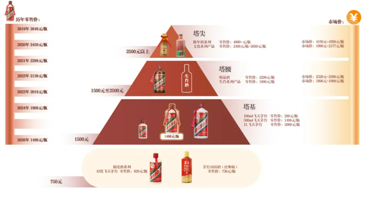 具体而言,在产品体系构建上,贵州茅台明确回归“金字塔”型结构,清晰划分各层级产品定位。其中,“塔基”以飞天茅台酒(53度、500ml)为主,辅以公斤茅台、100ml小茅台等其他规格产品;“塔腰”聚焦精品茅台与生肖茅台,着力将精品茅台酒打造成大单品;“塔尖”则涵盖陈年茅台系列与文化茅台系列产品,将适度收缩,维护超高端产品价值;此外,低度飞天茅台(43度 500ml)将作为重要支撑产品,重点聚焦主力消费场景、核心消费区域及年轻消费群体。