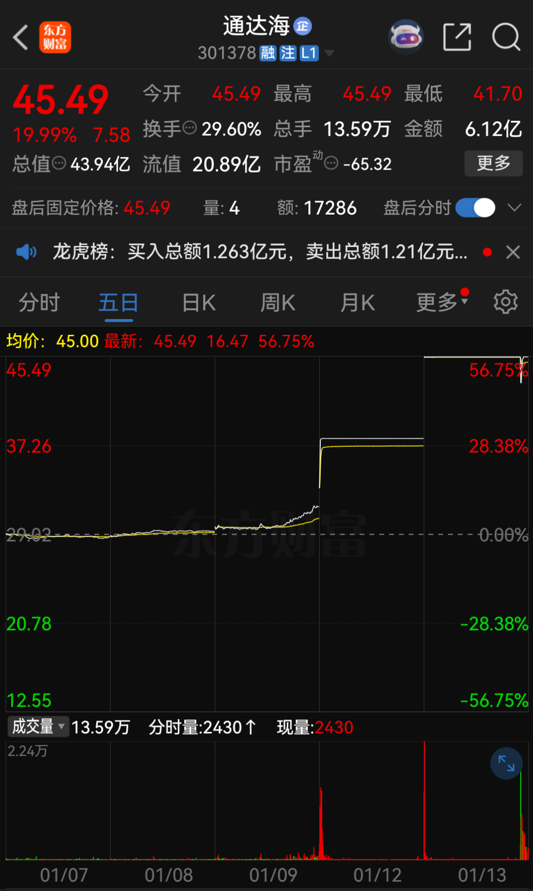 1月12日、13日,通达海均以涨停收盘。1月13日收盘,通达海股价报45.49元/股,涨幅达19.99%,总市值为43.94亿元。